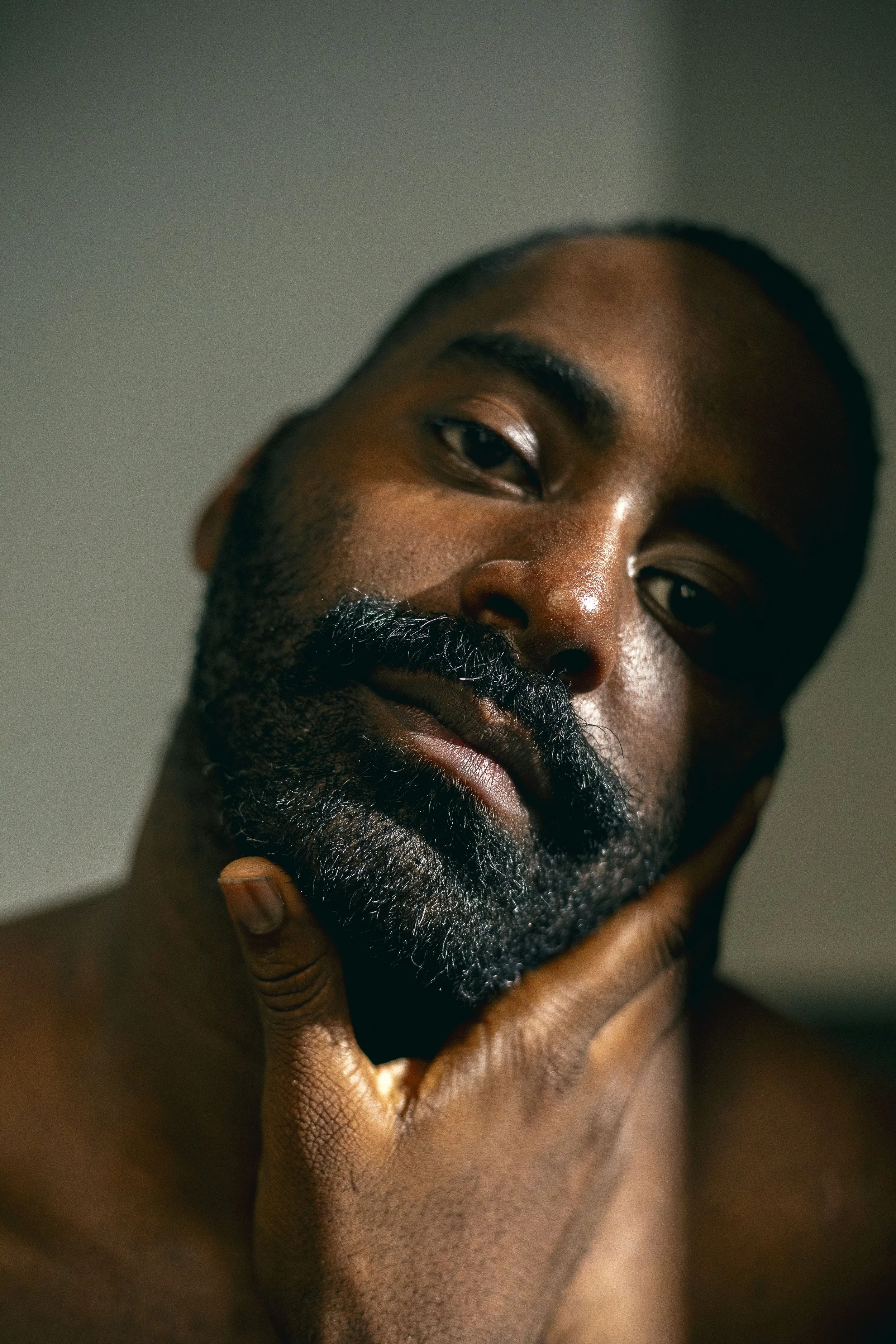 Photo by Melody Melamed. Color photo of Jerron shirtless and staring straight on framed by his hand